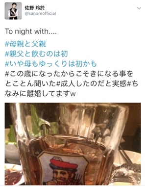 離婚しても父親・母親・佐野玲於さんの仲は悪くないようで、3人でお酒を飲みに行くこともあるようです。その様子もTwitterに投稿されています。